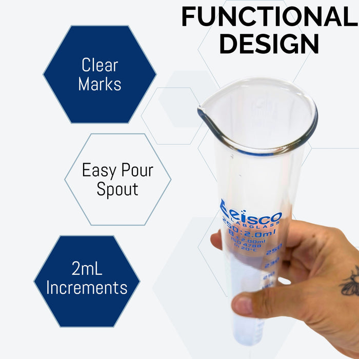 - INCLUDES || 250mL borosilicate glass measuring cylinder with detachable hexagonal base, spout for easy pouring, and protection collar for secure handling.