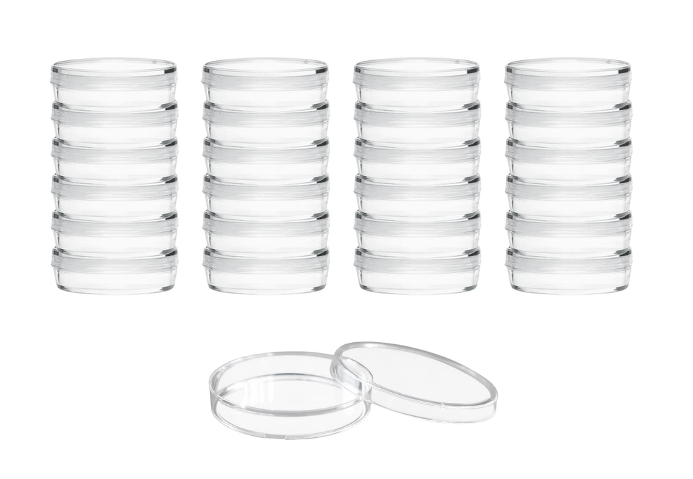 Pack of 25 disposable petri dishes made of high quality, transparent polystyrene plastic. Sterile. Triple vented lid to allow for airflow and discourage condensation build-up. Ideal for applications requiring better gaseous exchange or evaporation. Petri dish is packed individually in polyethylene bags and sterilized by radiation. Non-toxic, multifunctional and ready to use. Excellent for general laboratory applications, including cell culturing, plant germination, precipitate drying and solvent evaporation, home or classroom science experiments, crafting, small storage solutions and more.