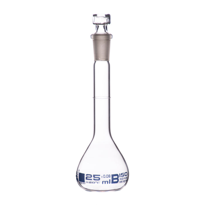 Volumetric Flask, 25ml - Class B - Hexagonal, Hollow Glass Stopper - Single, Blue Graduation - Eisco Labs