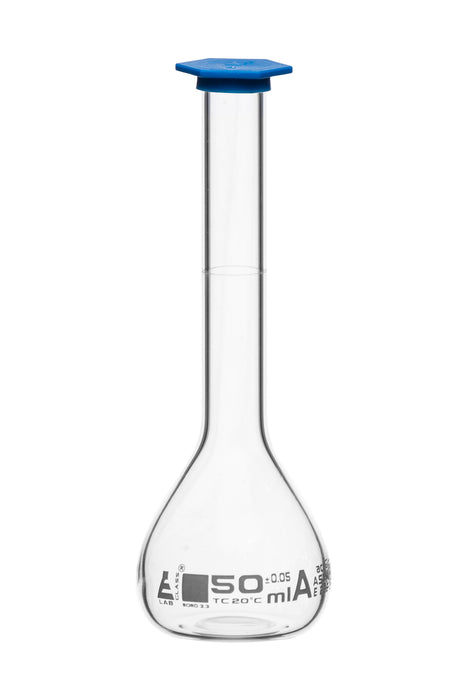 Volumetric Flask, 50ml - Class A, ASTM - Tolerance ±0.050ml - Blue Snap Cap - Single, White Graduation - Borosilicate Glass - Eisco Labs