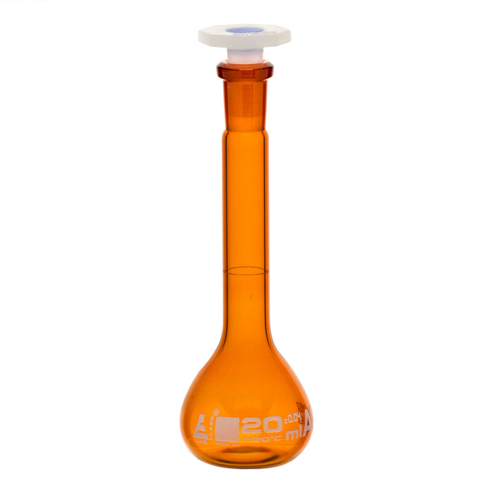 Volumetric Flask, 20ml - Class A - 10/19 Polypropylene Stopper, Borosilicate Glass, Amber - White Graduation Mark, Tolerance ±0.040 ml - Eisco Labs