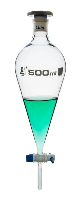 Eisco Labs Borosilicate glass separating funnel - Pear shaped, cap. 500ml, Socket size 24/29, Made of borosilicate glass with interchangeable plastic stopper and PTFE key stopcock. This unit is ungraduated