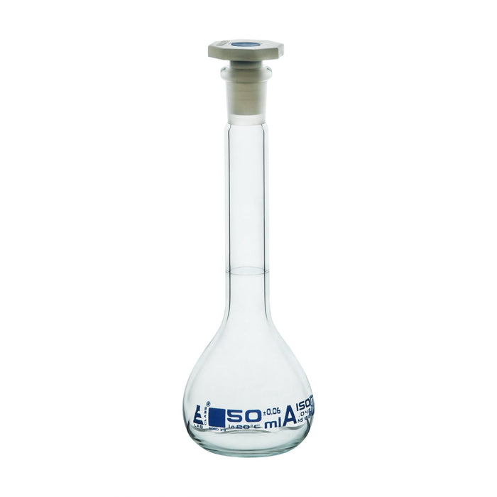 Volumetric Flask, 50ml - Class A Tolerance ±0.06ml - 12/21 Polypropylene Stopper - Single Graduation Mark - Borosilicate Glass - Eisco Labs