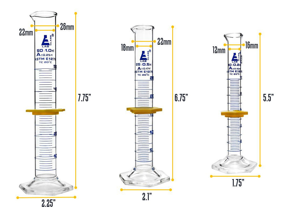 - 3 PIECE SET || Set includes three measuring cylinders. 10ml, 25ml & 50ml capacities. Each features a hexagonal base for maximum stability and is fitted with a removable, plastic protective collar