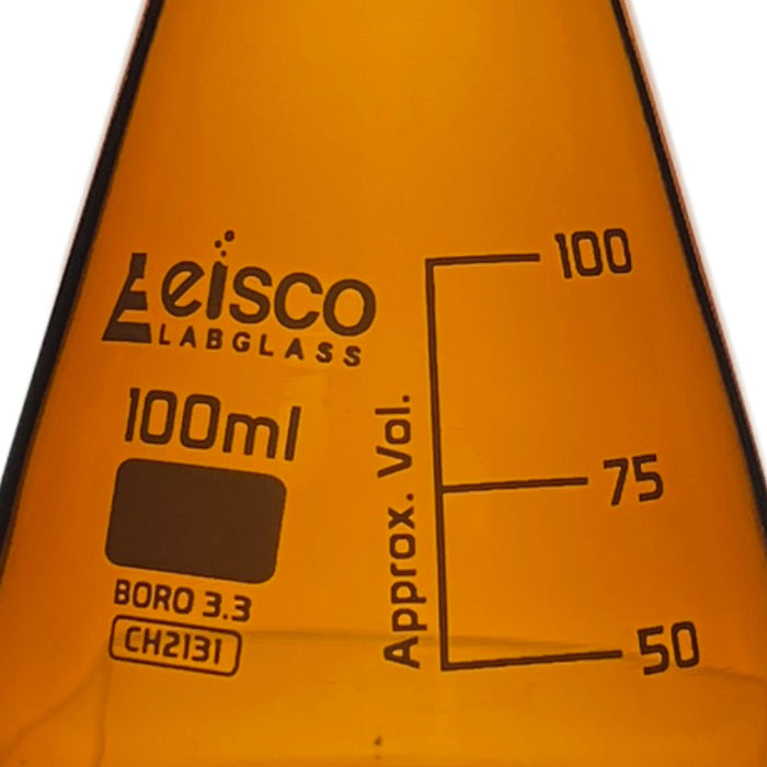 Eisco Labs - 100 mL Amber Erlenmeyer Flask with Graduated Markings at 50 mL, 75 mL, 100 mL, Borosilicate Glass for Light-Sensitive Solutions, Narrow Neck for Mixing, Storage, Heating, and Lab Use