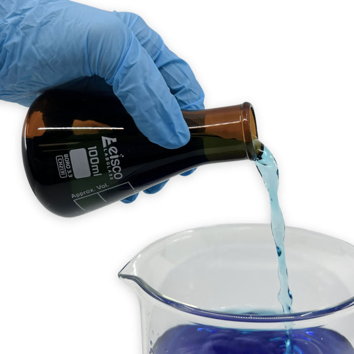 The Eisco Labs 100 mL Amber Erlenmeyer Flask is ideal for handling light-sensitive solutions. Its narrow neck design ensures easy mixing and swirling, while the amber borosilicate glass protects solutions from UV and visible light. Graduated at 50mL, 75mL, and 100mL, it provides convenient volume references for heating, mixing, and storing solutions. Perfect for labs working with photosensitive reagents and chemicals.