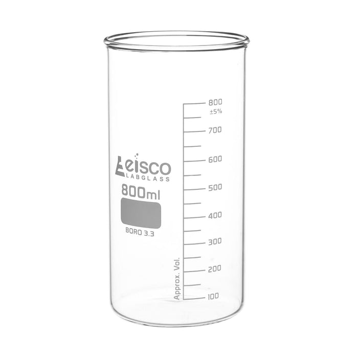 Berzelius Tall Form Beaker with 800mL capacity is made from heavy-duty borosilicate 3.3 glass. Uniform, tall walls are ideal for heating & stirring during titrations, and the smaller diameter makes it easier to handle than low form beakers of the same volume. It features white enamel markings every 50mL and labeled graduations every 100mL. Conforms to DIN 12331 and ISO 3819 standards. Beaker lacks a pouring spout, making it ideal for cooking glass, collecting vessels, and for preparing, mixing and heating solutions.