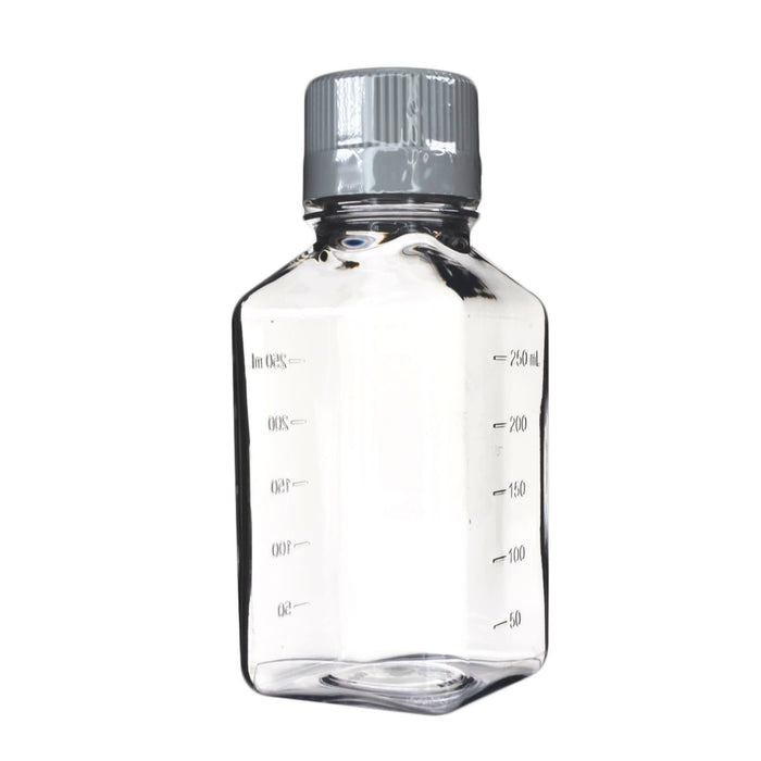 250mL PET media bottles with HDPE caps. Pack of 30. Leakproof and tamper-evident design for secure lab reagent and buffer storage. Lightweight and durable. Square: 60.4mm Height: 146.4mm Neck Diameter: 28.5mm