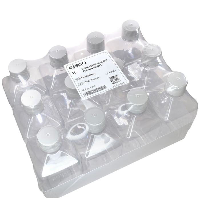 - PACK OF 12 MEDIA BOTTLES || Includes 12 non-sterile 1L PET bottles with secure HDPE caps, designed for laboratory reagents and buffer storage.