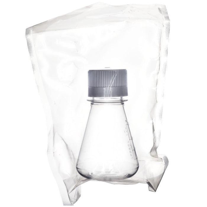 125mL sterile PETG Erlenmeyer flasks, pack of 24. Non-vented, flat bottom for stability. Impact-resistant, gamma sterilized, and USP Class VI compliant. Ideal for media prep, cell culture, and lab storage.