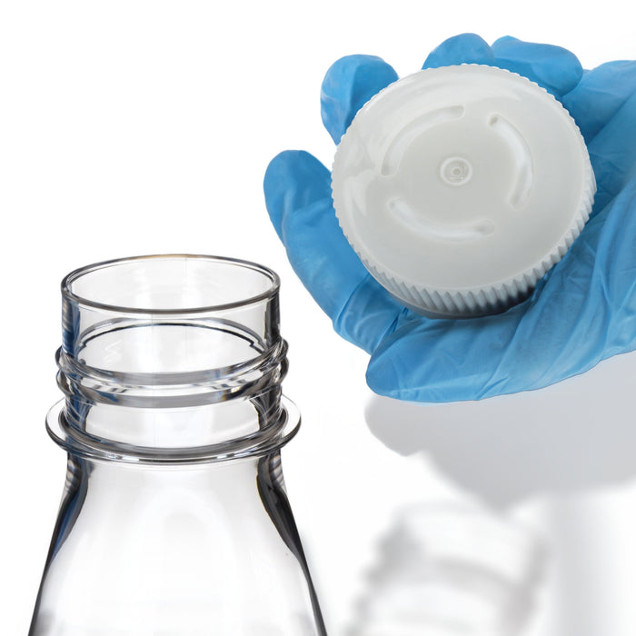 500mL sterile PETG Erlenmeyer flask with vented caps, pack of 1. Flat bottom for stability, gamma sterilized, and USP Class VI compliant. Ideal for biopharmaceutical applications, media prep, and cell culture.