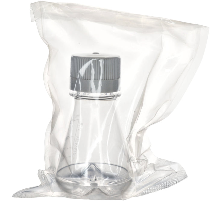 125mL sterile PETG Erlenmeyer flask with baffled bottom and non-vented caps, pack of 1. Designed for efficient mixing, gamma sterilized, impact-resistant, and compliant with USP Class VI standards.