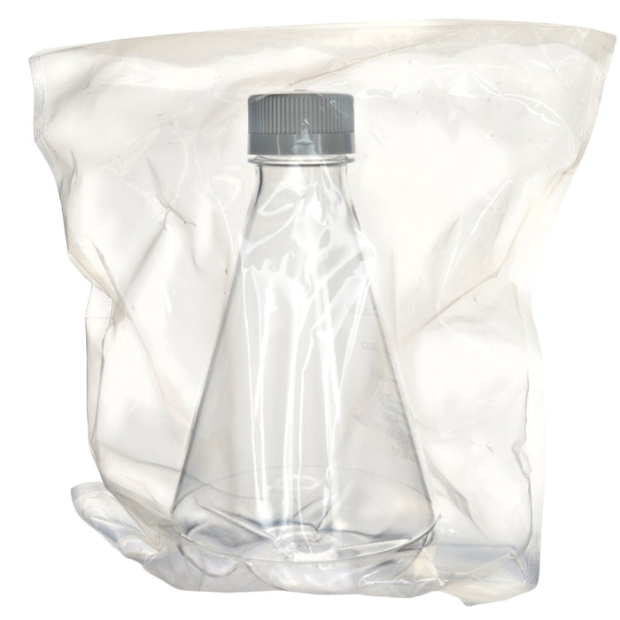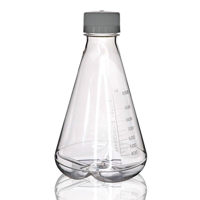 1L sterile PETG Erlenmeyer flask with baffled bottom and non-vented caps, pack of 1. Designed for efficient mixing, gamma sterilized, impact-resistant, and compliant with USP Class VI standards.
