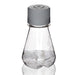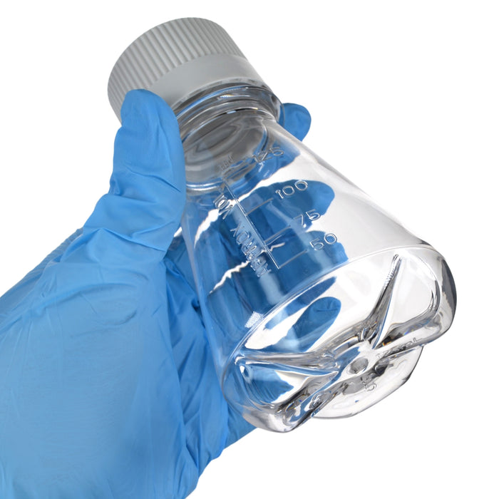 125mL sterile PETG Erlenmeyer flask with baffled bottom and vented caps, pack of 1. Designed for efficient mixing, gamma sterilized, impact-resistant, and compliant with USP Class VI standards.