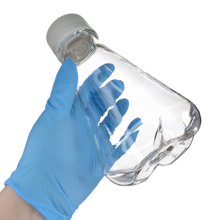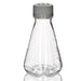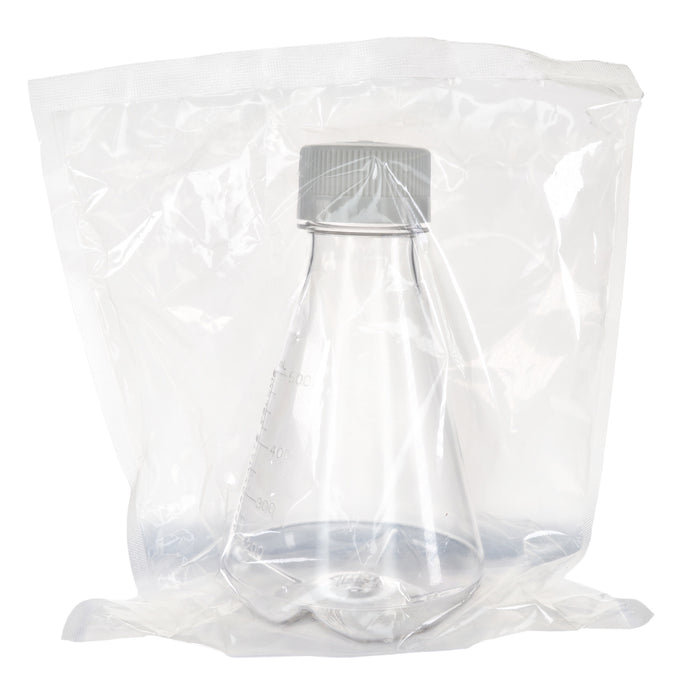 500mL sterile PETG Erlenmeyer flask with baffled bottom and vented caps, pack of 1. Designed for efficient mixing, gamma sterilized, impact-resistant, and compliant with USP Class VI standards.