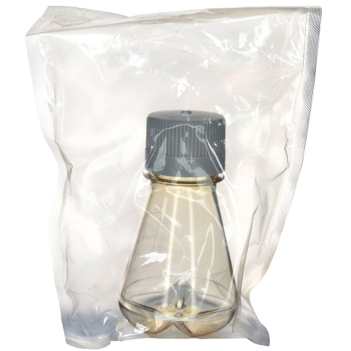 125mL sterile polycarbonate Erlenmeyer flask with baffled bottom and non-vented caps, pack of 1. Designed for efficient mixing, gamma sterilized, impact-resistant, and compliant with USP Class VI standards.