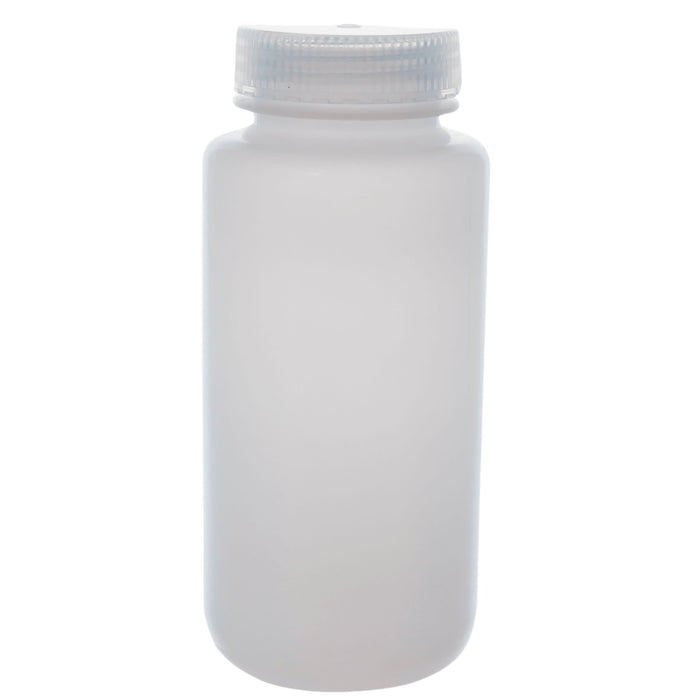 500mL wide mouth HDPE reagent bottles with polypropylene caps, available in a pack of 12. Designed for safe storage, transportation, and handling of laboratory reagents and solutions. Temperature range -100°C to 120°C, with a wide mouth for easy pouring and filling. Diameter: 73.7mm Height: 167mm