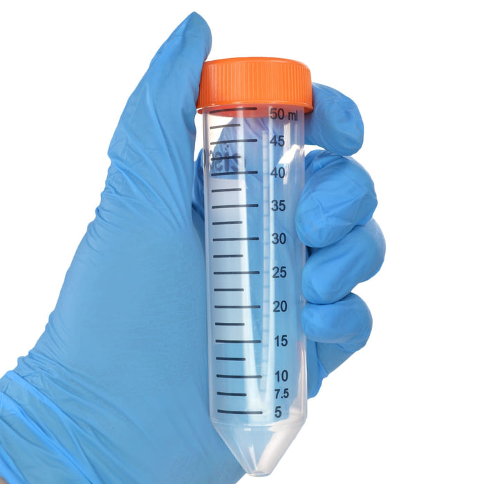 - 50ML CENTRIFUGE TUBES || Pack of 25 polypropylene centrifuge tubes with flat caps, non-sterile and racked for organized storage and handling.