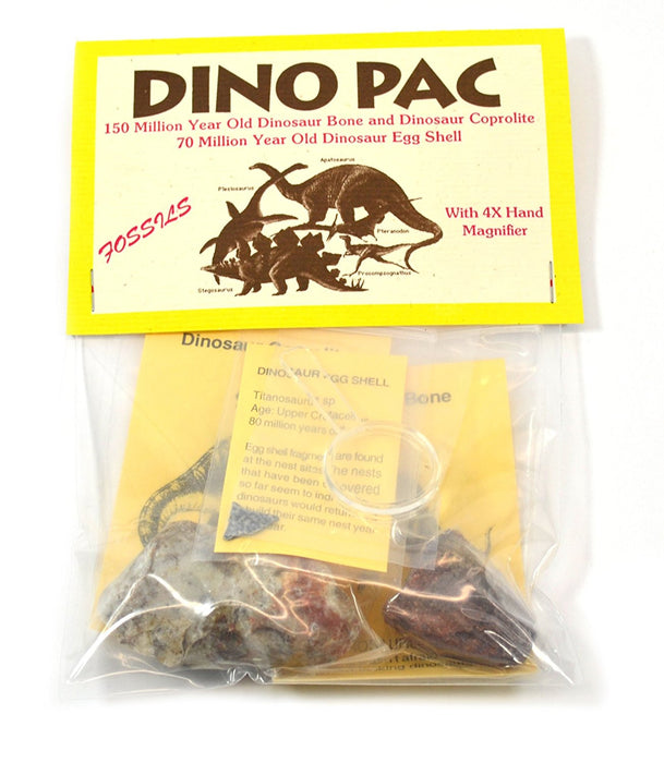 - The Dino Pac includes 3 dinosaur fossils: an egg shell, an ancient bone, and preserved dino dung