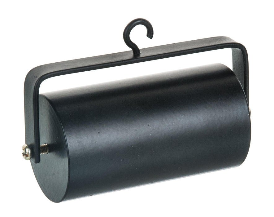 Solid metal 1 kg rollers, 8 cm wide, 4.3 cm dia. run on cone bearings and are mounted in a metal frame with provision for attaching cord.