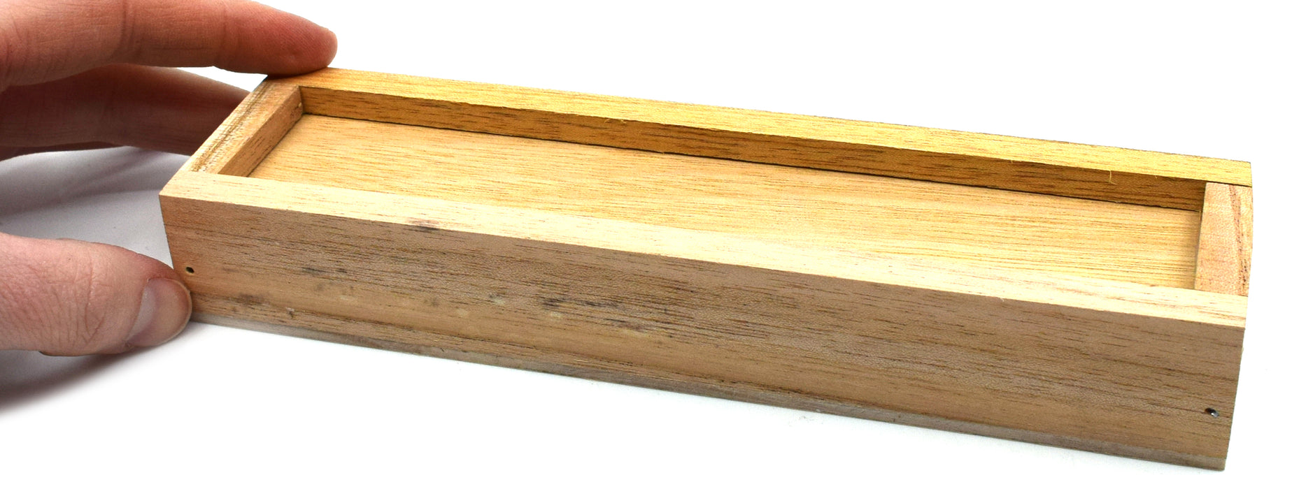 Wooden box with slide top, designed to keep spare bar magnet of up to 150mm in size. Box dimensions are 7" long, 2" wide, and 1" tall.
