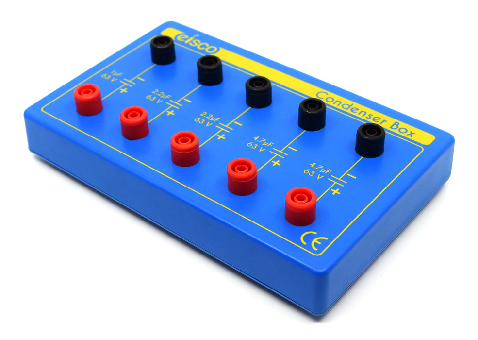Condenser box featuring five capacitators - 1µF, 2.2µF, 2.2µF, 4.7µF, 4.7µF. 63 volts. Useful for classroom demonstration and study of electricity. Box measures 8" wide, 5" long and 1.5" tall.