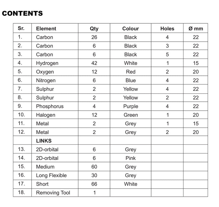 - Set consists of 122 atoms and 168 links for demonstrating single, double, and triple covalent bonds