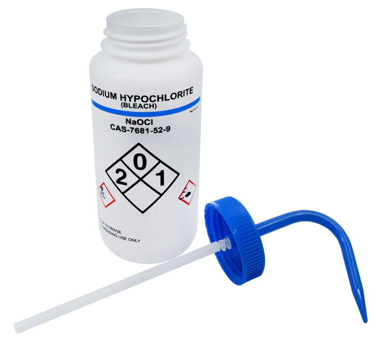 Labelled wash bottle for Sodium Hypochlorite (bleach). Bottle is made of LDPE, is self venting and features easy to read text and warning indicators. 500ml capacity. Bottle measures 9" tall, and 2.75" in diameter.